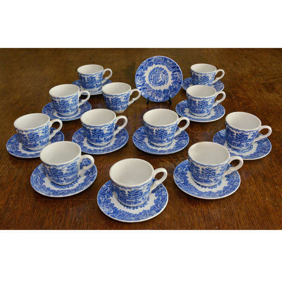 Conjunto de 12 xícaras com pires em porcelana inglesa azul e branca para café.