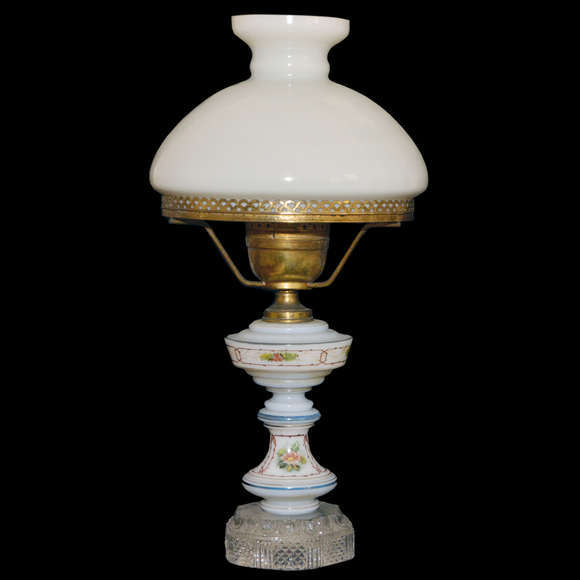 Abajur tipo lampião em opalina com base em cristal bico de jaca.