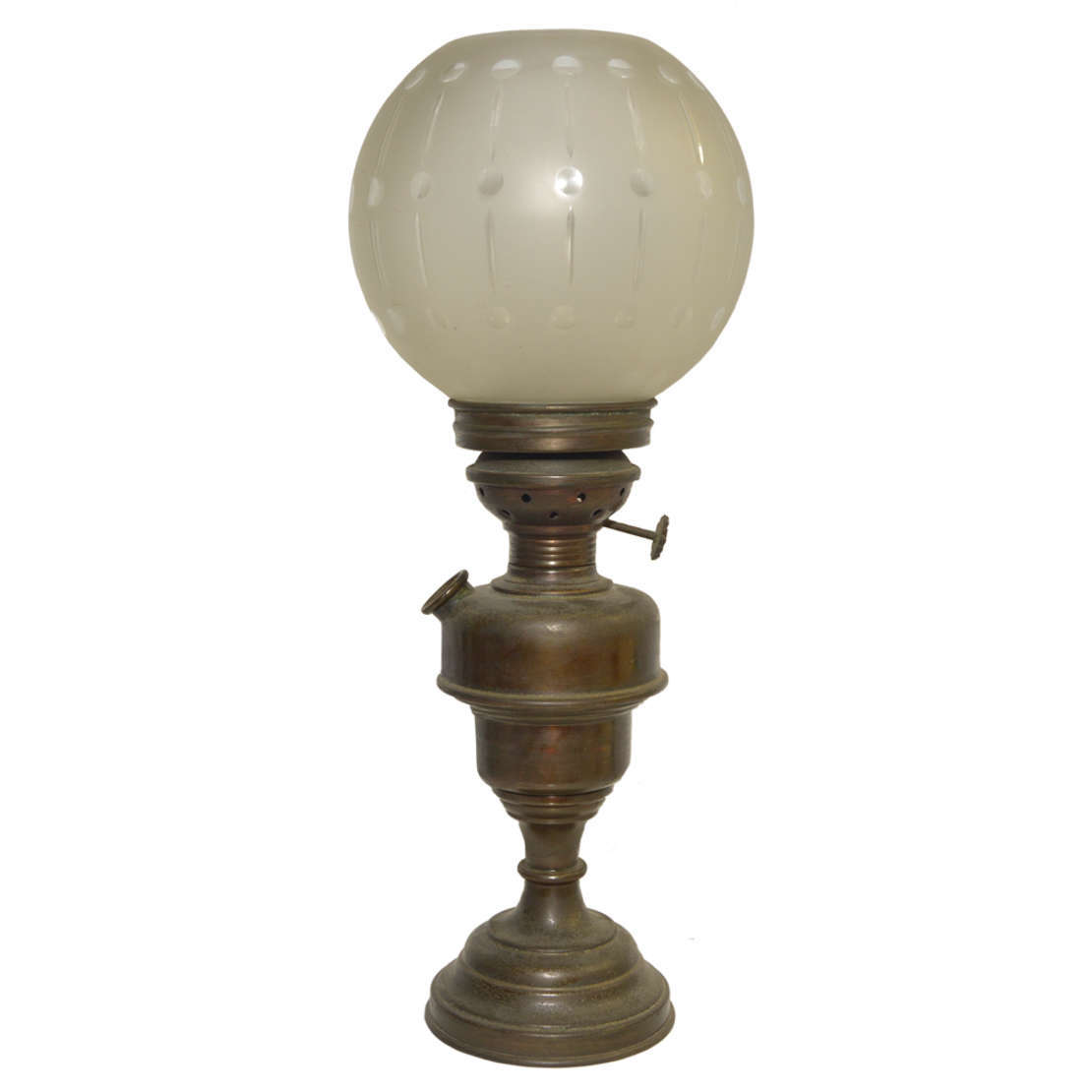 Abajur em metal trabalhado e patinado com cúpula em vidro fosco.
