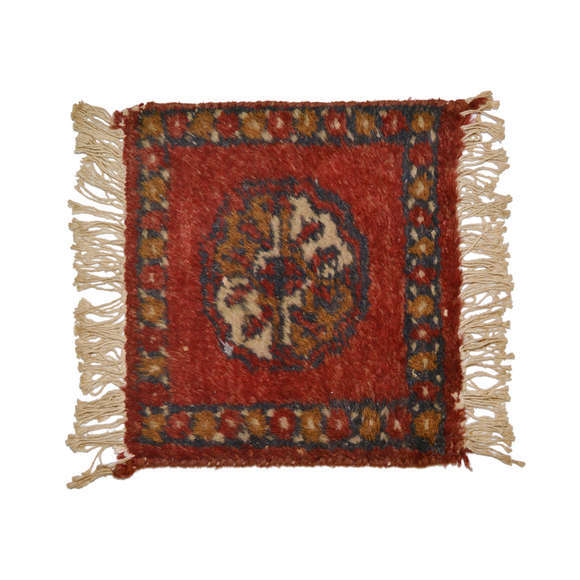 Tapete oriental de mesa vermelho decorado com motivo floral.