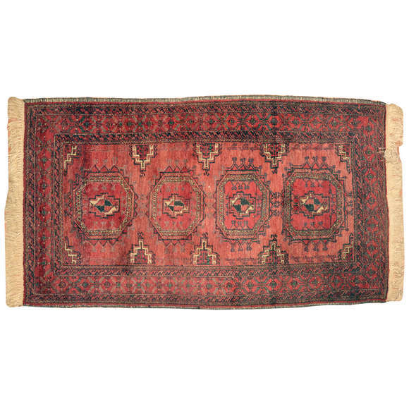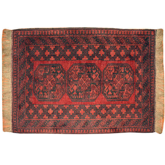 Tapete oriental decorado com motivos geométricos nos tons vermelho, verde azul e bege.