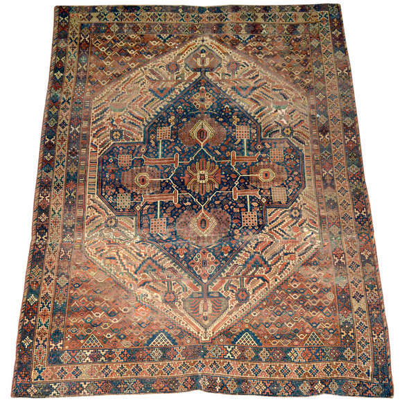 Tapete Shiraz nos tons azul, vermelho e bege.