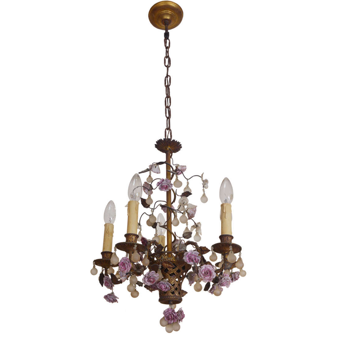 Lampadário em metal dourado com aplicações de figuras de anjos em bronze.
