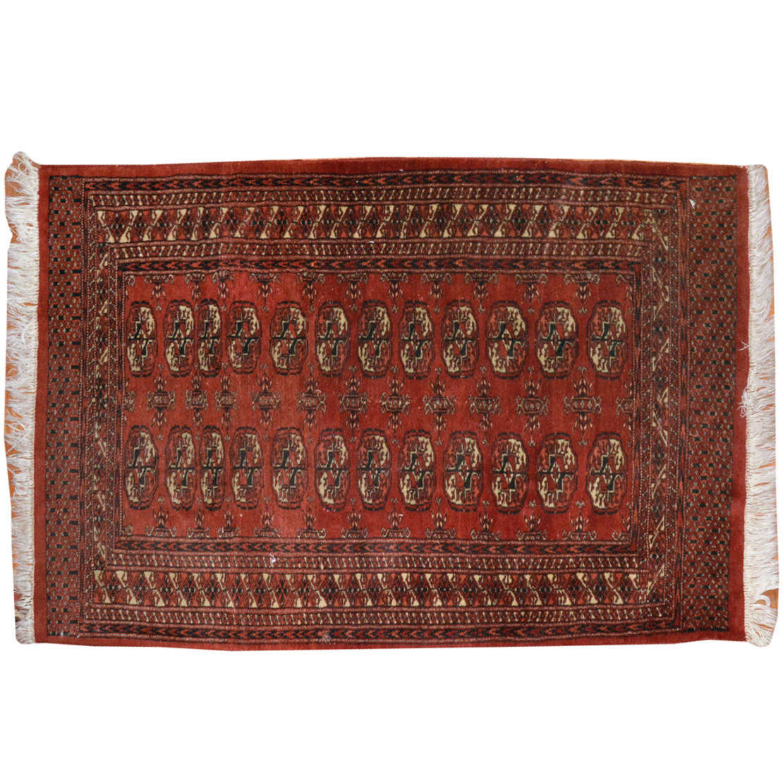Tapete oriental decorado com motivos geométricos nos tons vermelho, verde azul e bege.