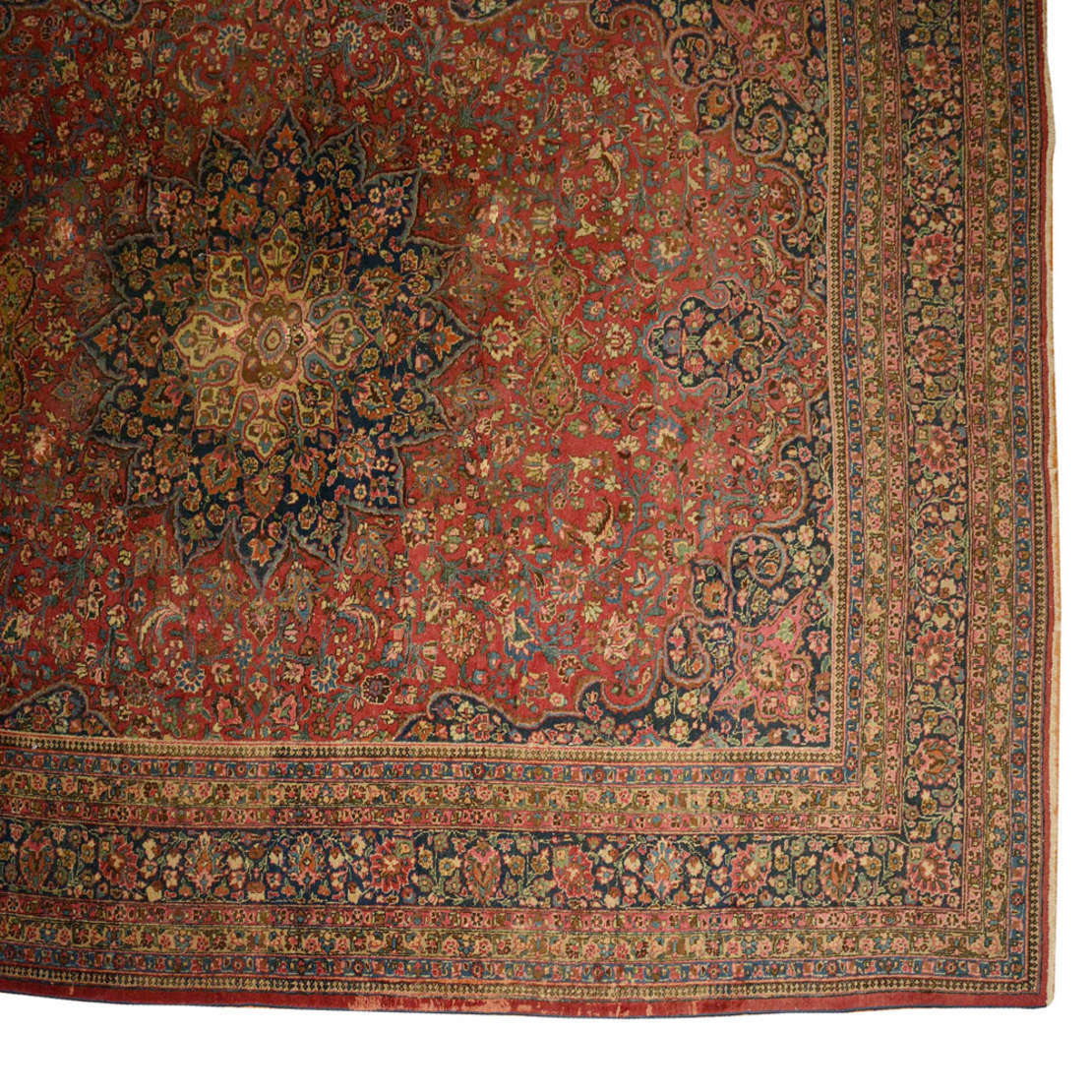 Tapete oriental decorado com motivos geométricos nos tons vermelho, verde azul e bege.