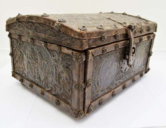 Raríssimo Baú de viagem Indo português do século XVI/XVII com estrutura em madeira e ferro forjado, toda coberta com ...