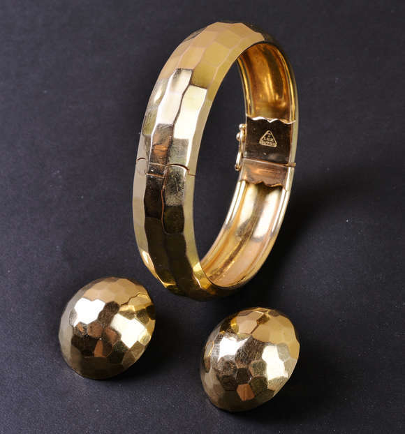 Conjunto em ouro amarelo 18 k estilo Art Deco composto por bracelete e par de brincos facetados, pesando respectivame...