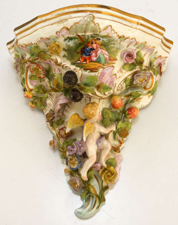 Grande peanha em porcelana alemã policromada guarnecida por querubim em reserva com cena romântica, medindo 20 cm de ...