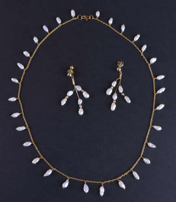 Conjunto composto por colar e par de brincos em ouro 18 k e pérolas de água doce (arroz), peso total aproximado 9.04 ...